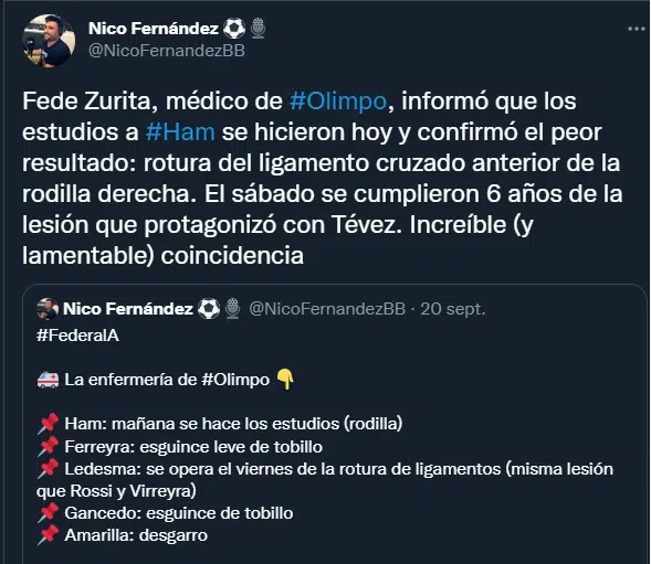 Actualmente Ezequiel Ham juega en Olimpo de Bahía Blanca. El último fin de semana se cumplieron 6 años de esa lesión, volvió a tener un problema en su rodilla. El diagnostico fue el mismo: rotura de ligamento cruzado de la pierna derecha. Creer o reventar por la misma lesión sufrida en diversos escenarios. Parece digno de una película de Hollywood.