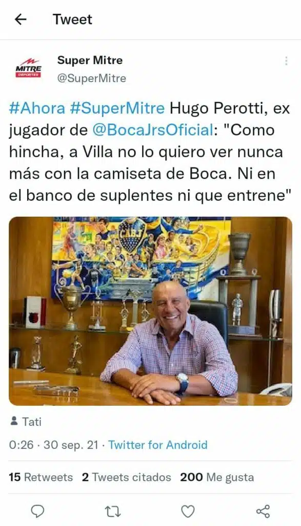 El ídolo de Boca, Hugo Perotti, volvió a atacar al delantero colombiano Sebastián Villa. En esta ocasión, dialogó con Super Mitre Deportivo y remarcó que no lo quiere ver nunca más con la camiseta azul y oro: “Como hincha, a Villa no lo quiero ver nunca más con la camiseta de Boca. Ni en el banco de suplentes ni que entrene“. Todo esto es en relación al accionar que tuvo el delantero en los últimos meses.