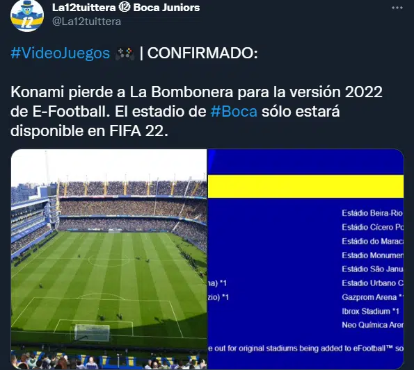 En los próximos días se hará el lanzamiento oficial de los dos principales juegos de fútbol que atraen a los adolescentes. La empresa Konami que produce Pro Evolution Soccer anunció que La Bombonera no lo tendrá en la edición 2022. Hace unos días Boca fue anunciado Partner oficial de FIFA 22. Esto incluía el equipo licenciado junto con el estadio.