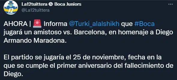 En las últimas horas empezó a circular una información sobre un partido homenaje que jugará Boca en honor a Diego Armando Maradona. En Europa se menciona la posibilidad de que el equipo xeneize juegue ante Barcelona el día 25 de Noviembre. Pero hay un grave inconveniente si se confirma la fecha: El 24 de ese mismo mes tiene encuentro por el certamen doméstico.