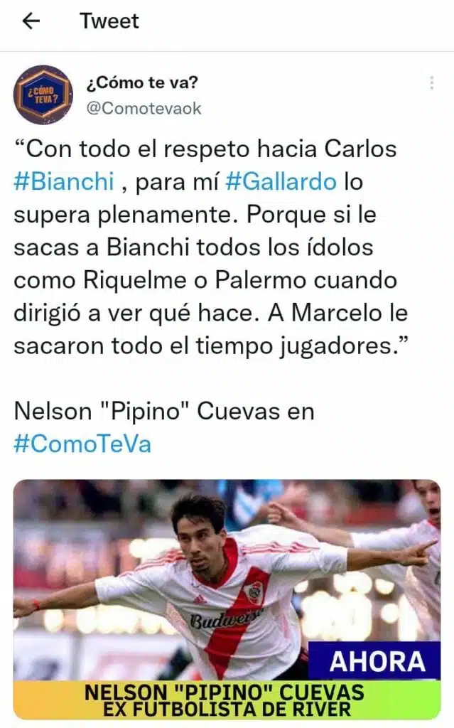 En la jornada de ayer, el exjugador de River Plate Nelson “Pipino” Cuevas, habló en el programa radial SuperMitre Deportivo. En ese sentido, realizó una comparación entre Marcelo Gallardo y Carlos Bianchi ex entrenador de Boca. Allí deslizó: “Con todo el respeto hacia Bianchi , para mí Gallardo lo supera plenamente. Porque si le sacas a Bianchi todos los ídolos como Riquelme o Palermo cuando dirigió a ver qué hace. A Marcelo le sacaron todo el tiempo jugadores.”
