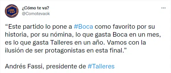 Este miércoles se juega la final de la Copa Argentina entre Boca y Talleres, ambos clubes se preparan para finalizar el año de la mejor manera. Por ahora, en el equipo cordobés le tiran la presión al Xeneize: “Lo que gasta Boca en un mes es lo que gasta Talleres en un año. Vamos con la ilusión de ser protagonistas en esta final“, comentó Andres Fassi, el presidente de la T.