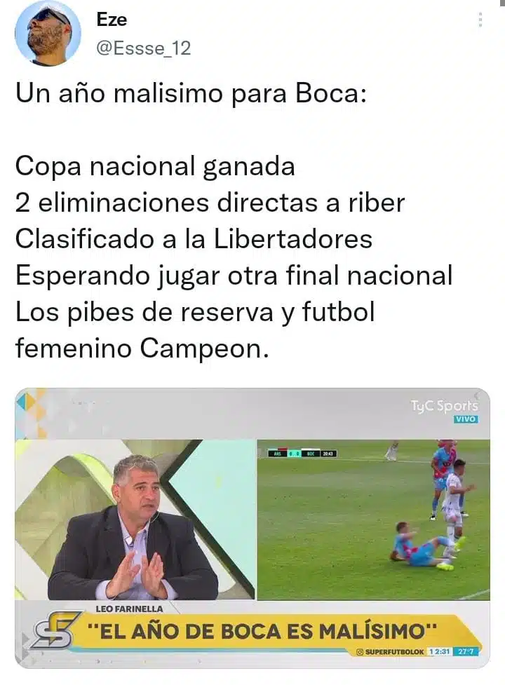 El periodista de TyC Sports, Leonardo Farinella, habló en el programa Súper fútbol sobre Boca. En ese sentido, expresó: “El año de Boca es malísimo”. A partir de allí, los hinchas bosteros le respondieron rápidamente: “Copa nacional ganada, dos eliminaciones directas a River; clasificado a la Libertadores, esperando jugar otra final nacional, los pibes de reserva y fútbol femenino campeón”.