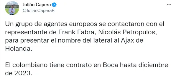 “Un grupo de agentes europeos se contactaron con el representante de Frank Fabra, Nicolás Petropulos, para presentar el nombre del lateral al Ajax de Holanda. El colombiano tiene contrato en Boca hasta diciembre de 2023“, escribió y sorprendió a todos, el periodista colombiano Julián Capera. Una noticia que sacudió al mundo Boca.