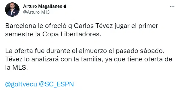 Carlos Tevez dejó de jugar al fútbol a mediados del año pasado, cuando selló su salida de Boca, el club de sus amores, pero nunca quedó claro si sería el adiós definitivo a su carrera como futbolista o un hasta luego. El Apache recibió en las últimas horas un ofrecimiento del Barcelona de Ecuador, club que tiene como gran objetivo volver a dar pelea en Copa Libertadores.