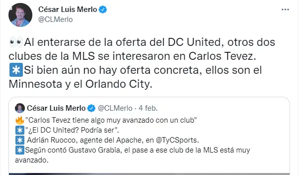 Según indicó César Luis Merlo, periodista especializado en transferencias, Minnesota United y Orlando City también tienen en la mira al ex-Juventus y buscan competirle al DC United para quedarse con los servicios del argentino. Igualmente, ninguno de los clubes realizaron una oferta concreta por Carlos, no hay nada oficial y los próximos días serán fundamentales.