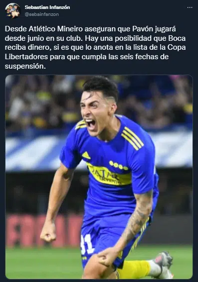 Con pre contrato arreglado, según el vicepresidente de Mineiro, José Murilo Procópio. Cristian Pavon, jugador Xeneize hasta el 30 de julio, se iría de Boca en cinco meses rumbo a Brasil, sin dejarle dinero al club. No obstante, tras la noticia del pre acuerdo, sonó la posibilidad de que Boca sea compensado economicamente. Si anota a “Kichan” en su lista de buena fe de la Copa Libertadores, “el 7 Bravo” podría cumplir con su sanción a tiempo.