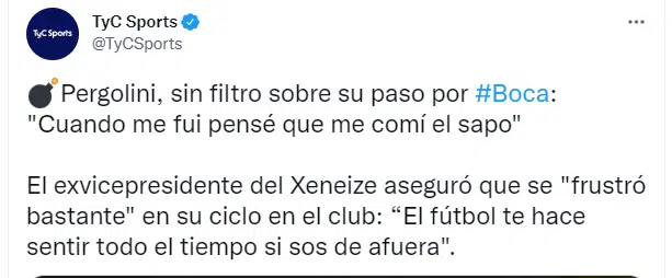 Por último, Pergolini habia reflexionado sobre el trabajo que se necesita hacer a nivel dirigencial en un club de fútbol argentino: “Nadie entiende qué es gestión, no quiere decir que yo lo entienda, yo no lo pude llevar adelante. Pero todo el mundo cree que con decir ‘esto es boca’… Hay que gestionar, tenemos que tener gente capacitada alrededor“.