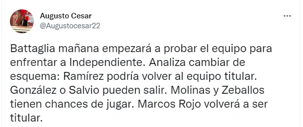 Battaglia mañana empezará a probar el equipo para enfrentar a Independiente. Analiza cambiar de esquema: Ramírez podría volver al equipo titular. González o Salvio pueden salir. Molinas y Zeballos tienen chances de jugar. Marcos Rojo volverá a ser titular”, comentó Augusto César, periodista de ESPN en sus redes sociales.