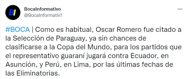 En las últimas horas, el entrenador Guillermo Barros Schelotto dio a conocer la lista de jugadores convocados para la selección de Paraguay y en Boca se sorprendieron por la decisión de convocar a Óscar Romero. Recordemos que el mellizo se va a perder el encuentro de esta noche ante Estudiantes, por una sobrecarga muscular.