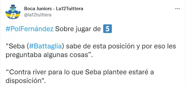 Por otra parte, Fernández fue el jugador del equipo comandado por Battaglia que más pases completó, el 2º que más pelotas recuperó, detrás de Juan Ramírez, y el 3º en intercepciones. En una nueva función, demostró que está la altura para ocupar ese lugar y los hinchas del Xeneize se ilusionan con seguir viéndolo en un alto nivel, al igual que todo el equipo.