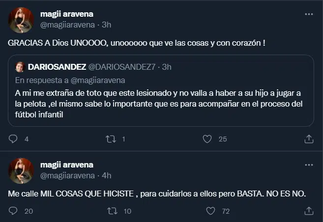 “GRACIAS A Dios UNOOOO, unoooooo que ve las cosas y con corazón”, citó Magalí Aravena en su cuenta de Twitter cuando un usuario respondió a una de sus publicaciones y manifestó cierto desconcierto por la ausencia del Toto en un partido de fútbol de su hijo. Esto suponiendo que Salvio tenía tiempo de asistir estando lesionado.