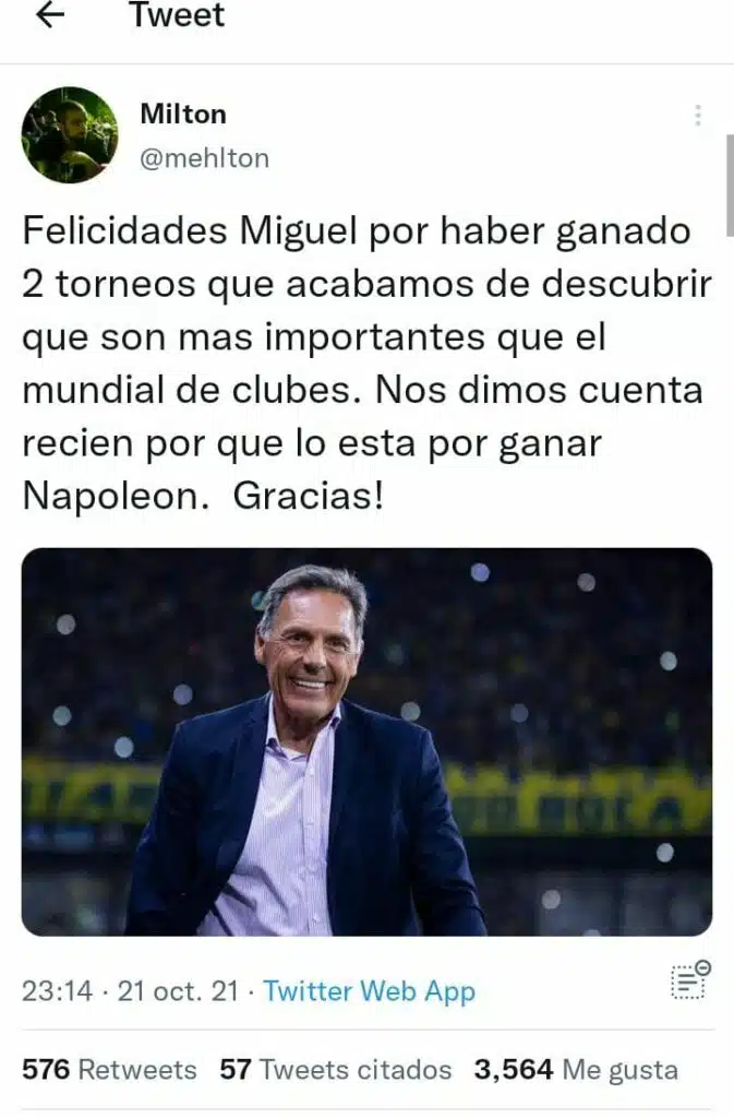 El extécnico de Boca Juniors, Miguel Ángel Russo, recibió un mensaje de un hincha en las redes sociales. En ese sentido, el bostero expresó: “Felicidades Miguel por haber ganado 2 torneos que acabamos de descubrir que son mas importantes que el mundial de clubes”. Sin embargo, sus palabras no terminan ahí ya que agregó: “Nos dimos cuenta recién por que lo esta por ganar Napoleón, gracias!.