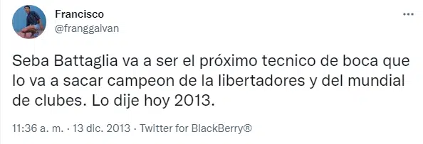 Francisco, cuyo usuario es franggalvan, publicó el siguiente mensaje: “Seba Battaglia va a ser el próximo técnico de Boca que lo va a sacar campeón de la Libertadores y del Mundial de Clubes. Lo dije hoy 2013”. Quizás él esperaba que el entrenador asuma en su cargo poco después de ese tuit, pero lo cierto es que hubo que esperar ocho años.