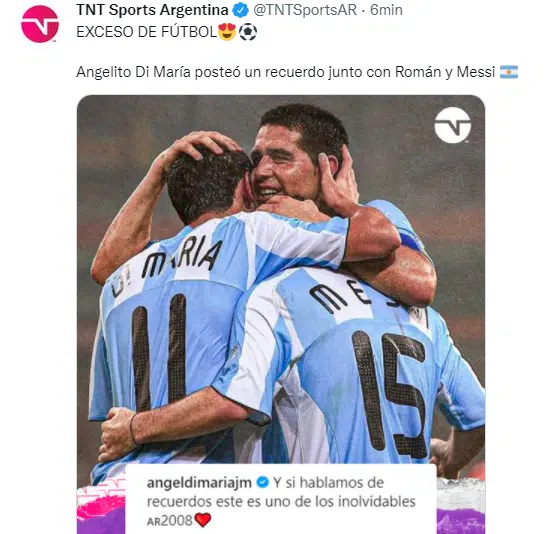 “Y si hablamos de recuerdos este es uno de los inolvidables 2008″, escribió el jugador del París Saint-Germain junto a un emoji de corazón. En la foto se los ve a Di María, Riquelme y Messi abrazados en un festejo. En aquel año, compartieron cancha con la Selección Argentina que viajó a los Juegos Olímpicos de Beijing. Por otra parte, consiguieron ser los campeones y se colgaron la medalla de oro.
