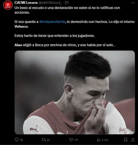 Por ese motivo, tanto fanáticos de Independiente como de Boca poblaron las redes sociales del futbolista y lo mencionaron en repetidas ocasiones en cada posteo.. De parte del Rojo, hubo ciertos insultos y desazón ante su posible llegada al Xeneize, así como también recibió amenazas. Mientras está cerca de arribar a Boca, los hinchas de Independiente insultaron a Alan Velasco en sus redes sociales: “No pisas más Avellaneda”